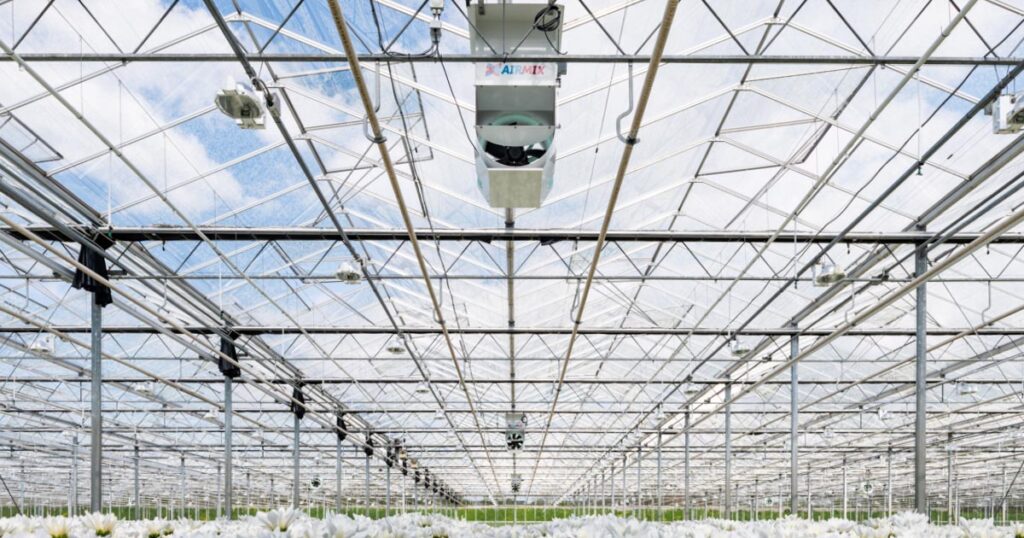 ‘We zien steeds meer telers die moeite hebben om te ontvochtigen en het klimaat gelijkmatig te houden. Dat was ook de vraag waarmee René van Kester ons benaderde. Hij had van collega-chrysantentelers gehoord over de Airmix en kwam bij ons met de vraag of het ook op hun bedrijf toepasbaar zou zijn’, zegt Rob van Hulzen van Van der Ende Group. Als accountmanager én Airmix-specialist constateert hij een groeiende vraag naar een systeem dat twee vliegen in één klap slaat. Of eigenlijk drie: lichthinder tegengaan. Ook door wettelijke maatregelen moeten telers de emissie van assimilatiebelichting in de nacht beperken. Dankzij de Airmix kan het scherm onder de belichtingsinstallatie gesloten blijven met behoud van het optimale klimaat.