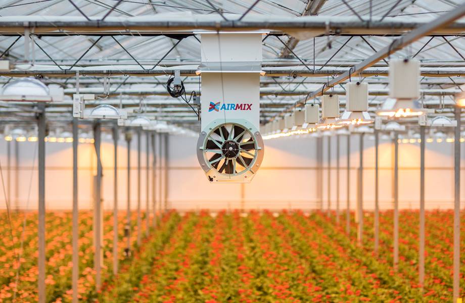 De Airmix is een jonger systeem. Inmiddels is er zo’n twee jaar praktijkervaring; de eerste gebruiker was Van den Berg Roses. “We zagen dat in de markt behoefte is aan een oplossing die goed aansluit bij de wensen van de klant, toepasbaar in zowel nieuwbouw als bestaande bouw. Een systeem met luchtbehandelingskasten en slurven vergt een hoge investering en is alleen mogelijk bij nieuwbouw, maar ook verticale ventilatie kan volgens ons simpeler. We gaan uit van bestaande horizontale ventilatoren, die we zowel gebruiken voor de horizontale circulatie als voor de aanzuiging van droge lucht van boven het scherm”, vertelt Ton van der Kooij van Van der Ende Groep…