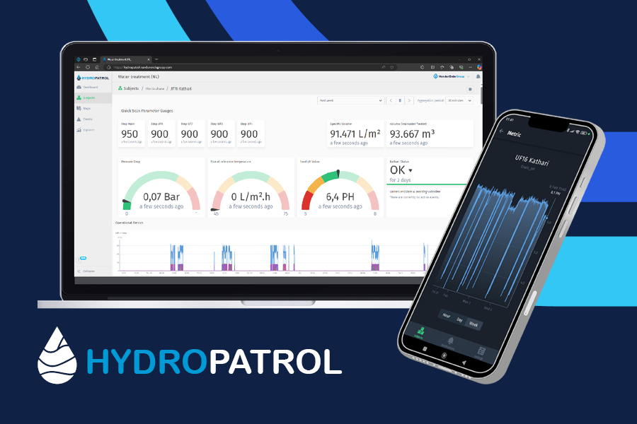HydroPatrol verzamelt en analyseert continu data uit de installatie en biedt direct inzicht in prestatieparameters zoals waterkwaliteit, doorstroom en druk. Dankzij automatische alarmering worden afwijkingen vroegtijdig gesignaleerd, waardoor stilstand wordt geminimaliseerd en onderhoudskosten kunnen worden beheerst. Daarnaast maakt het platform op afstand ingrijpen mogelijk, waardoor fysieke servicebezoeken in veel gevallen niet direct noodzakelijk zijn.