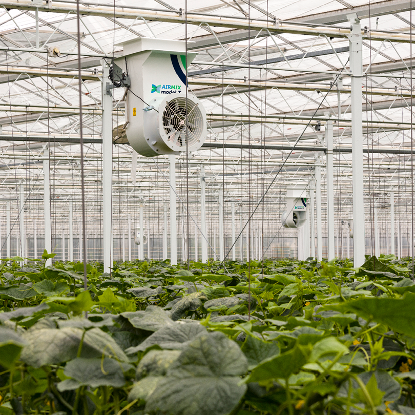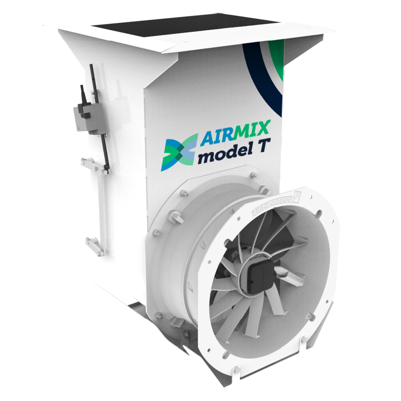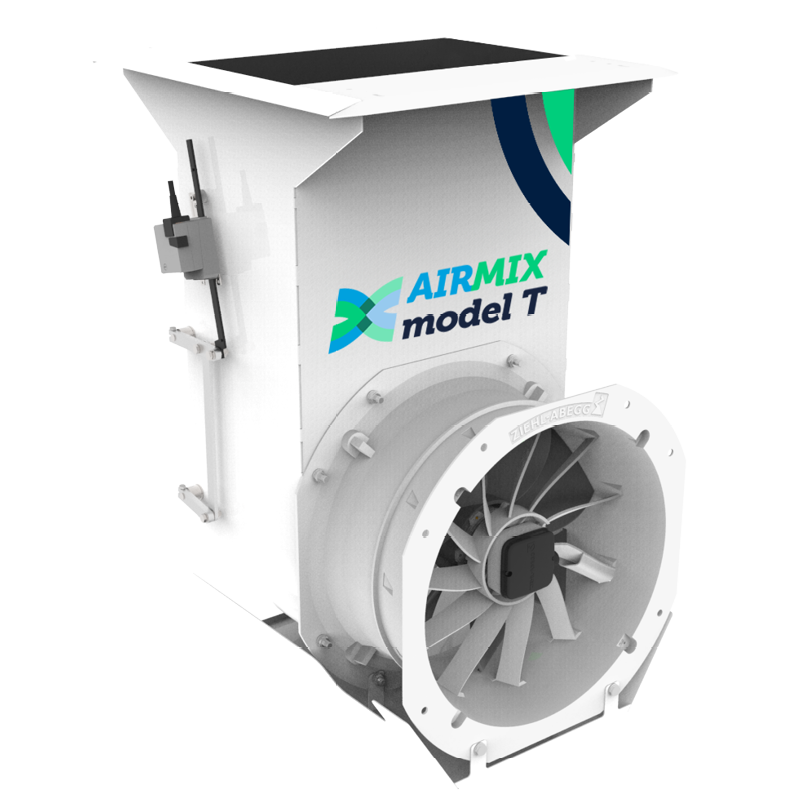De Airmix model T heeft modulerende kleppen om de juiste mix van koude en warme lucht in de kas te brengen. Op deze manier is het mogelijk om met een gesloten schermdoek te kunnen ventileren en ontvochtigen. Tevens werkt de Airmix als een horizontaal circulatiesysteem. Met de Airmix is het mogelijk om ‘gestuurd’ te ventileren en is het niet meer nodig om onder koude buitenomstandigheden een ‘schermkier’ te trekken om vocht en/of warmte naar buiten toe af te voeren. Airmix model T wordt bevestigd aan de onderzijde van de tralieligger op dezelfde wijze als horizontale ventilatoren.