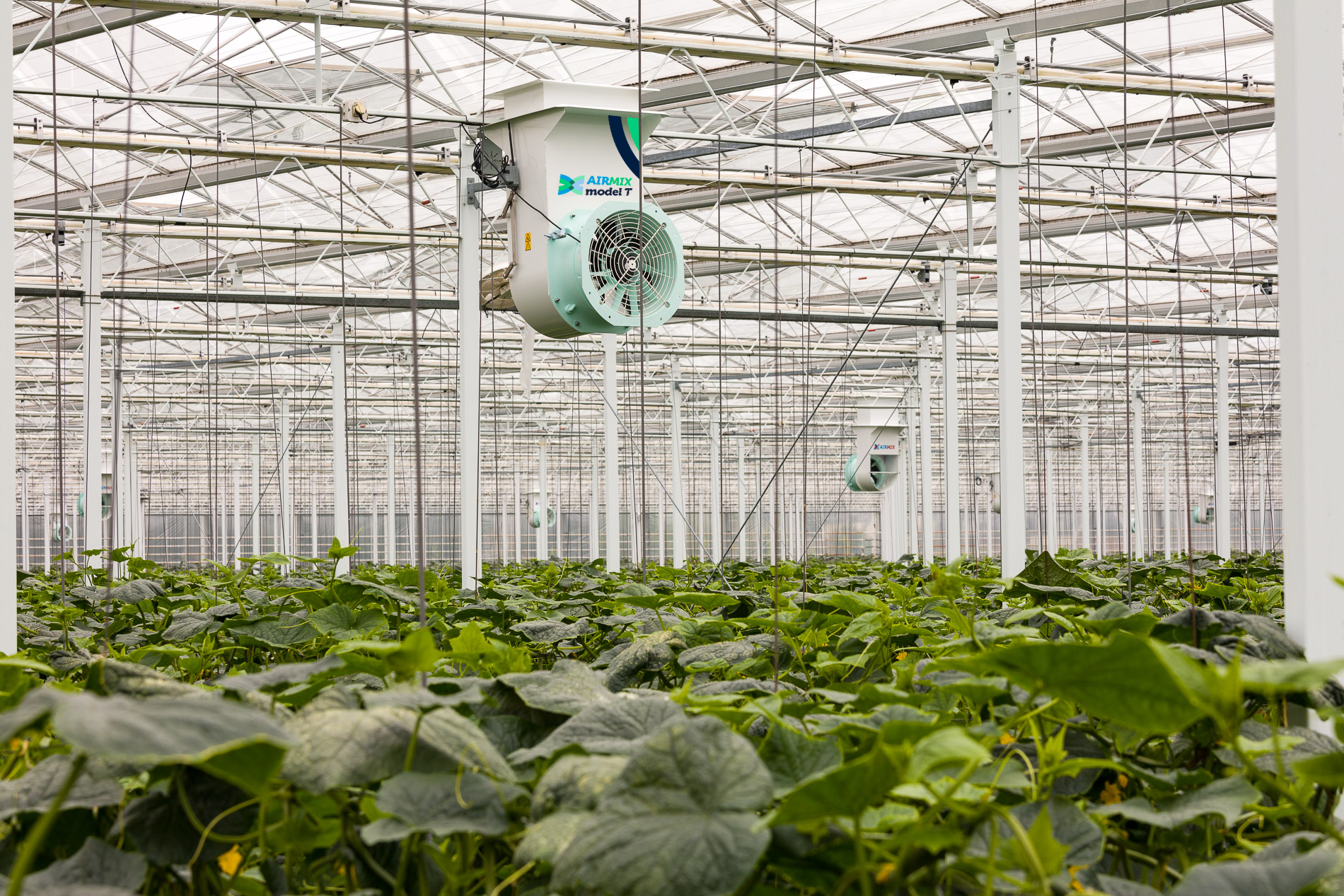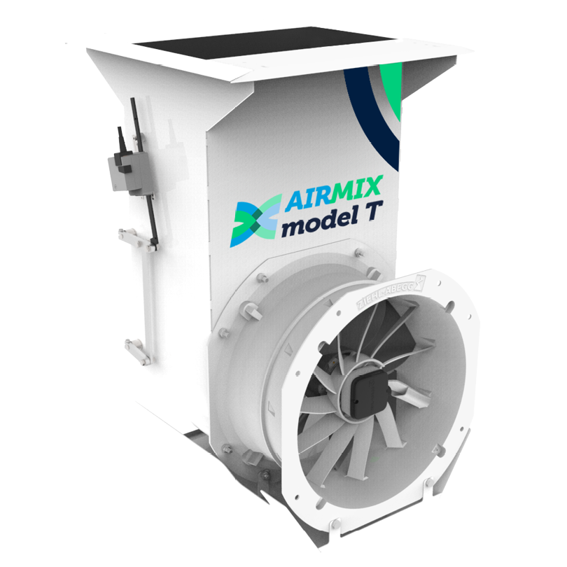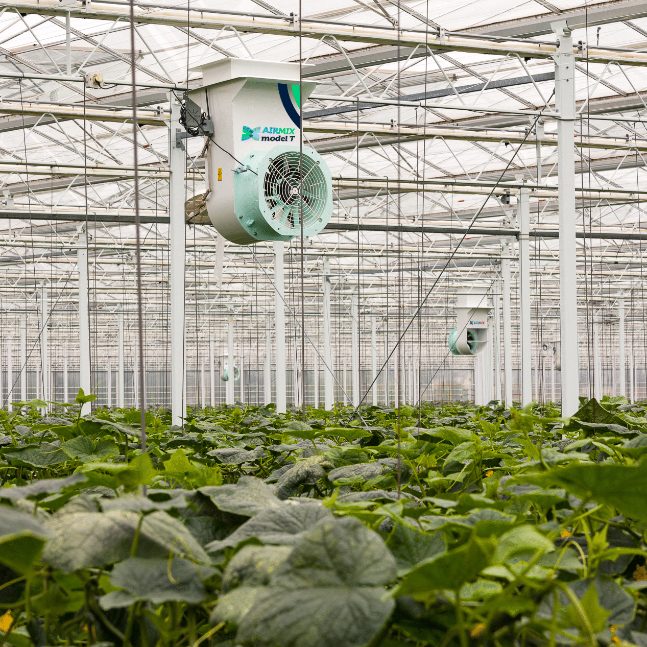 The Airmix model T has modulating valves to ensure that the right mixture of warm and cold air is introduced into the greenhouse. This makes it possible to provide ventilation and dehumidification with closed screens. The Airmix also works as a horizontal circulation system. The Airmix enables ‘controlled’ ventilation and you no longer need to open a gap in the screen for moisture and/or heat to escape when outdoor conditions are cold. The Airmix model T is attached to the underside of the trellis beam in the same way as horizontal fans.